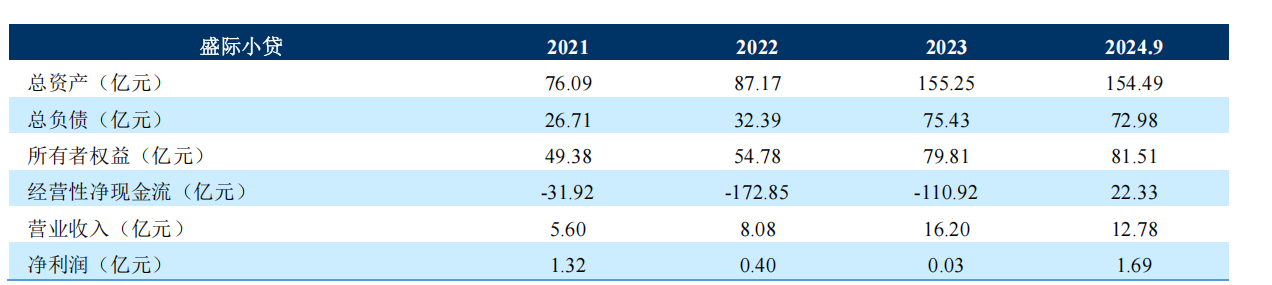 在主要财务数据上,截至2024年9月末,盛际小贷资产总额为154.49亿元,负债总额为72.98 亿元,所有者权益为81.51亿元。2024年1-9月,盛际小贷实现营业收入为12.78亿元,净利润为1.69亿元。