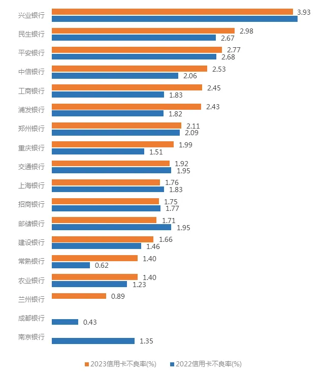 图1:18家上市银行2023年、2022年信用卡不良率情况
