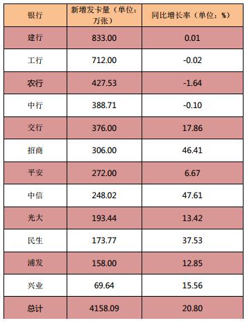 发卡量:中信招商民生发卡位增速列前三