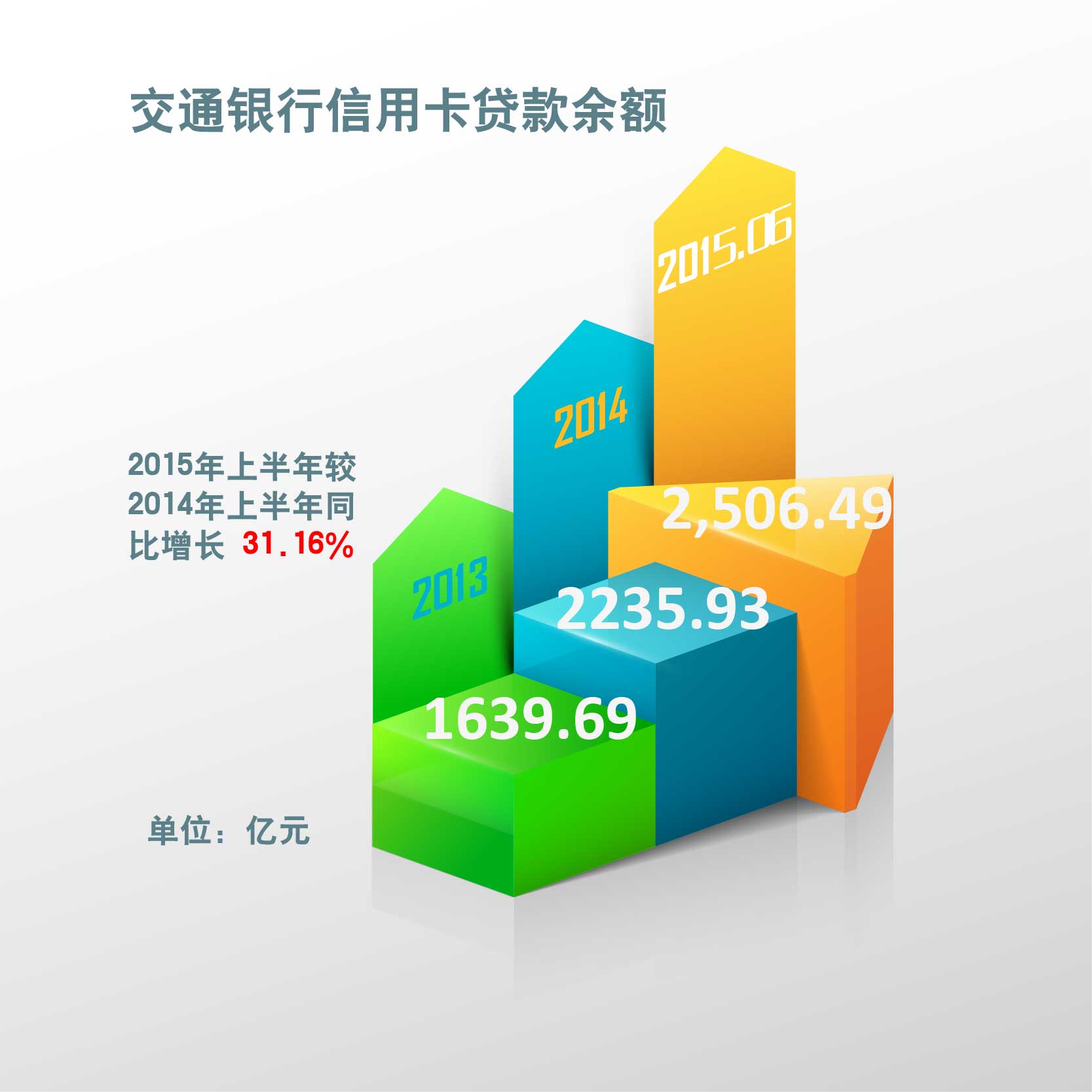 截止2015年6月末,交行信用卡贷款余额为2,506.49亿元,同比增长31.16%。