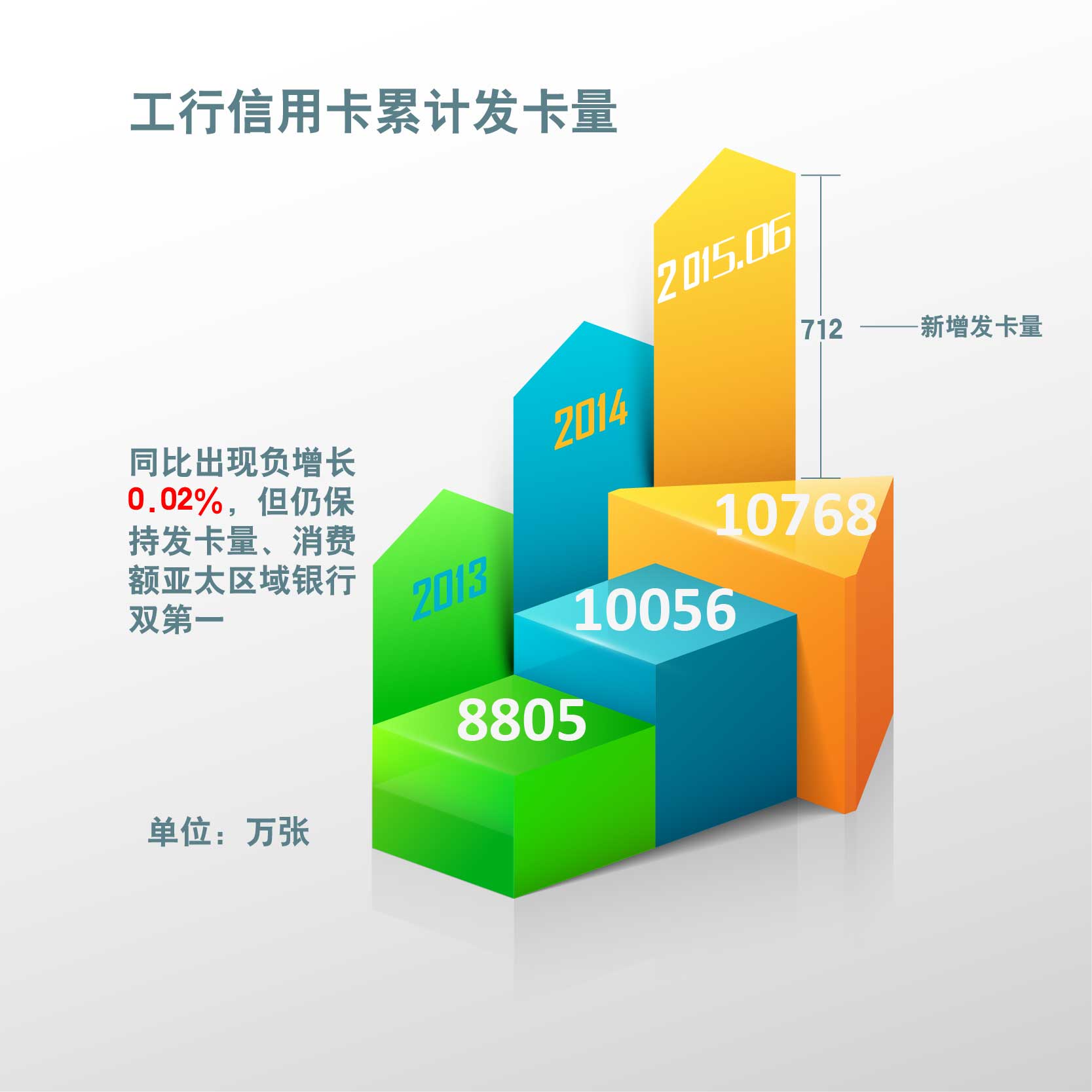 报告显示截止2015年6月末,工行信用卡累计发卡量10768万张,新增发卡量712万张,同比出现负增长0.02%,但仍保持累计发卡量、消费额亚太区域银行双第一。