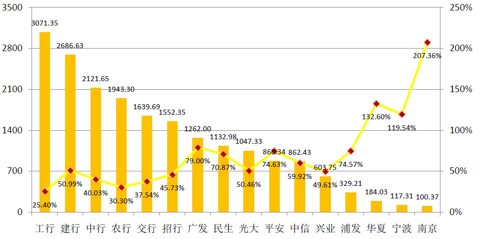 表1:各大银行2013年新增发卡量汇总(降序排列)